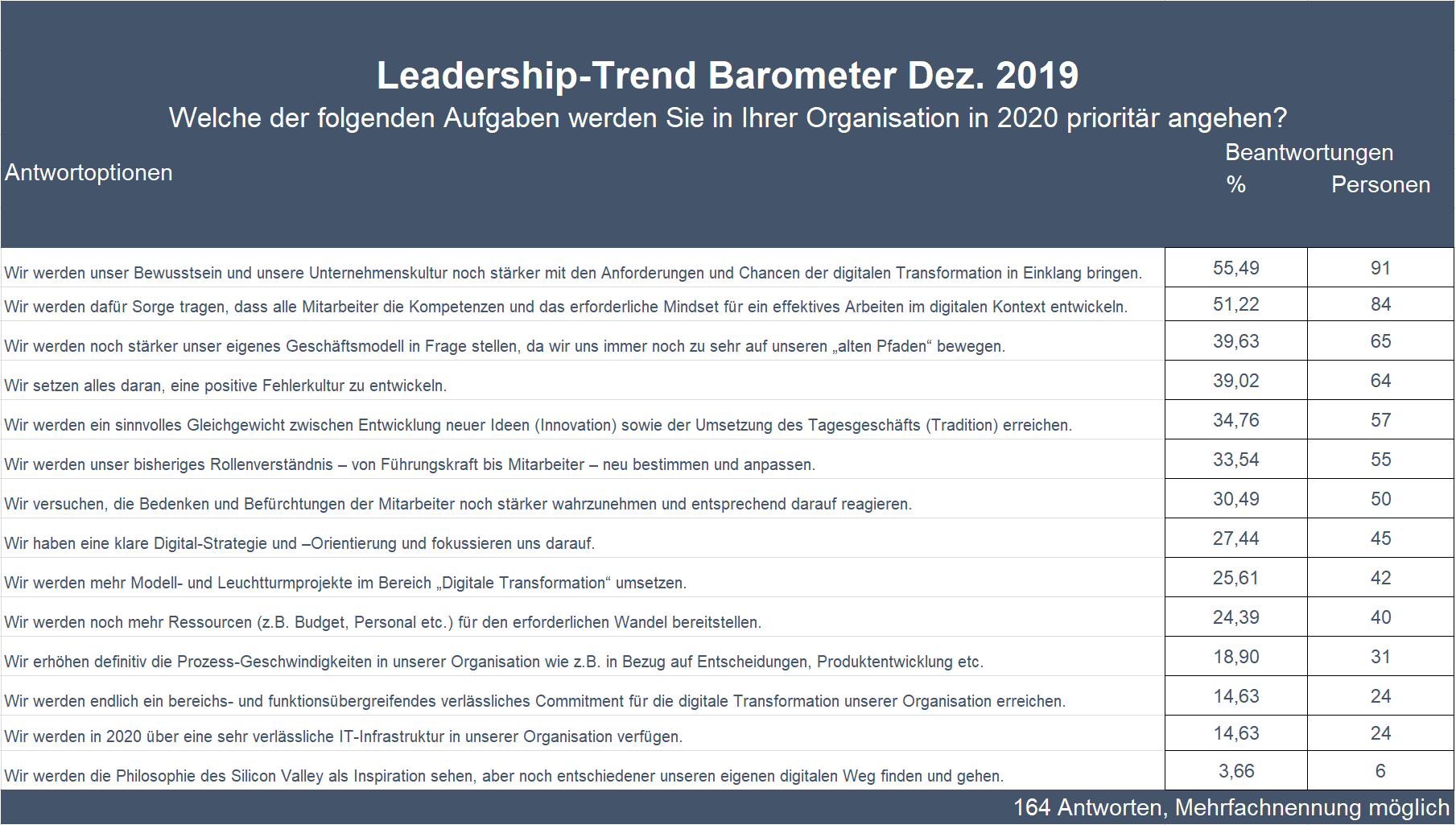 Regularly, the IFIDZ conducts online surveys of executives on selected leadership topics. Now, the results of our Leadership Trend Barometer from December 2019 are available.