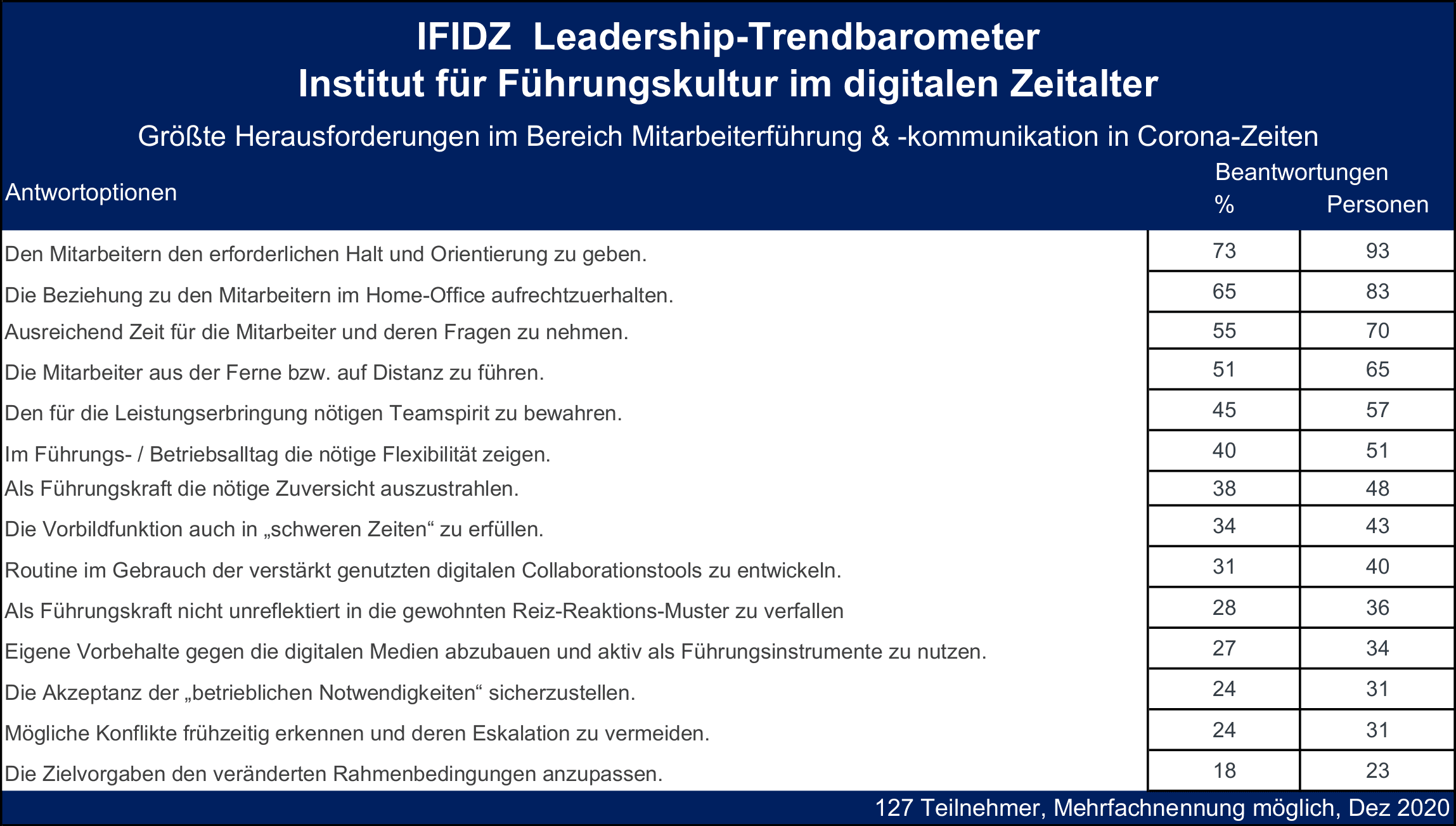 In the online survey that underlies the trend barometer, the IFIDZ wanted to know from the participating leaders what the greatest challenges in employee leadership and communication are during Corona times. A maximum of three answers were possible. Among the top 4, two items emerged from the survey that, in our opinion, are closely related to the deep uncertainty that many employees are currently experiencing.