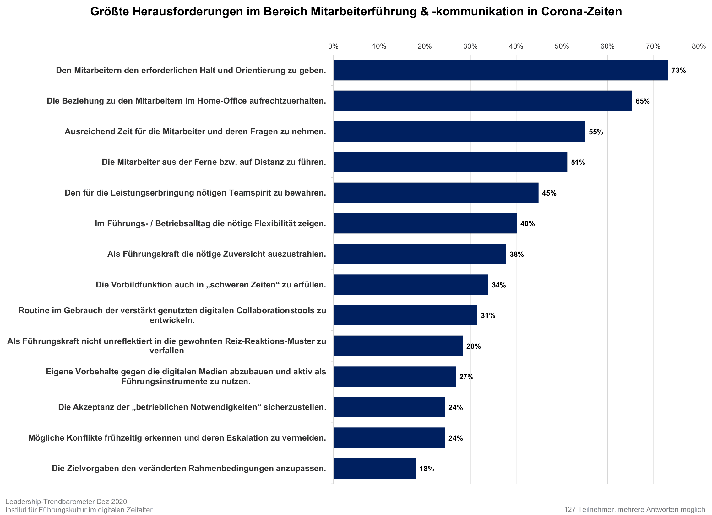 Also among the top 4 greatest challenges were two items that are closely linked to the currently increased need to lead employees at a distance. Nearly two-thirds of the surveyed leaders (65 percent) identified “maintaining relationships with employees in home office” as one of their greatest challenges at this time, and more than half (51 percent) generally noted the task of “leading employees from a distance.”