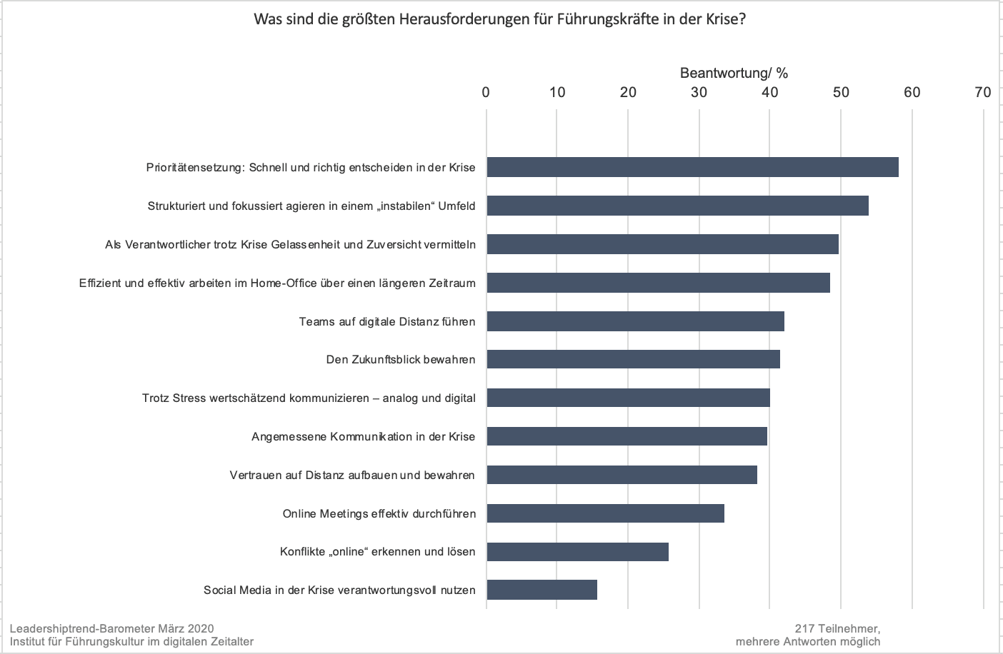 „Was sind aus Ihrer Warte in der aktuellen Krise die größten Herausforderungen für Führungskräfte?“ Das wollte das Institut für Führungskultur im digitalen Zeitalter (IFIDZ), Frankfurt, in seinem Leadership-Trendbarometer Ende März anlässlich der aktuellen Corona-Krise wissen.