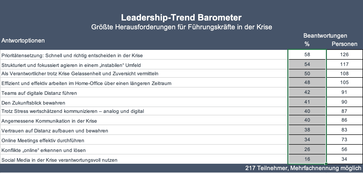Überraschend sind diese Ergebnisse nicht, denn: Wenn eine Krise sämtliche Strategien und Planungen der Unternehmen obsolet macht, ist es die erste Aufgabe der Führungskräfte die veränderte Situation zu reflektieren und die Prioritäten neu zu setzen. Nur dann ist ein effektives Krisenmanagement möglich. Zugleich ist dies die Voraussetzung, um als Leader und Chef trotz Krise Gelassenheit und die Zuversicht „Wir schaffen das“ auszustrahlen und den Mitarbeitern die gewünschte Orientierung und den nötigen Halt zu geben.